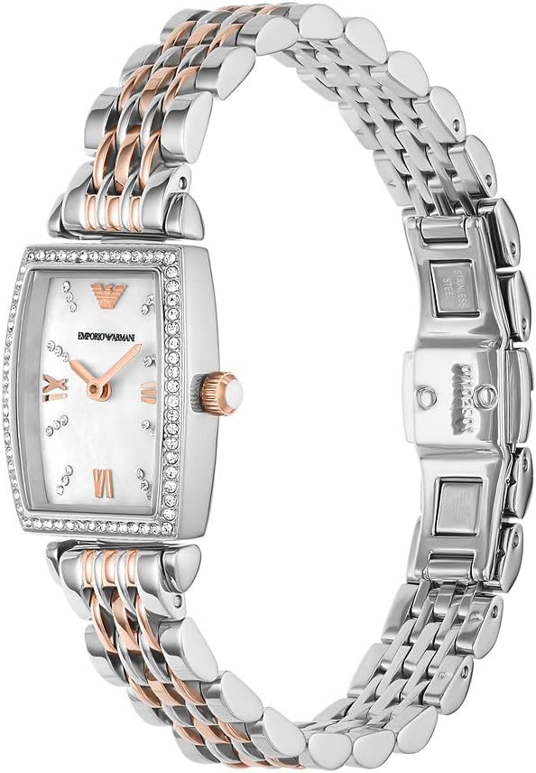 El Reloj Emporio Armani Gianni T‑Bar AR11519 combina elegancia femenina y minimalismo sofisticado. Su esfera de madreperla blanca resplandece con sutiles reflejos, mientras la pulsera bicolor plateado y rosé gold aporta un toque refinado. El diseño T‑Bar le da personalidad sin sobrecargar, perfecto tanto para looks formales como diarios, con una proporción compacta de solo 26 mm. Incluye 2 años de garantía oficial.