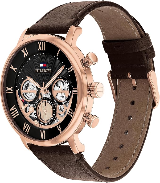 El Reloj Tommy Hilfiger Legend 1710566 destaca por su esfera esqueletizada negra con manecillas en tono rosé gold que revelan el sutil movimiento del mecanismo. Esta pieza de 44 mm fusiona estilo contemporáneo y sofisticación casual, ideal para un look elegante sin esfuerzo. La correa de cuero marrón añade comodidad y contraste clásico, mientras que su diseño multifunción incluye día, fecha y formato 24 horas. Ideal para quienes buscan una estética moderna con carácter distintivo. Incluye 2 años de garantía oficial.