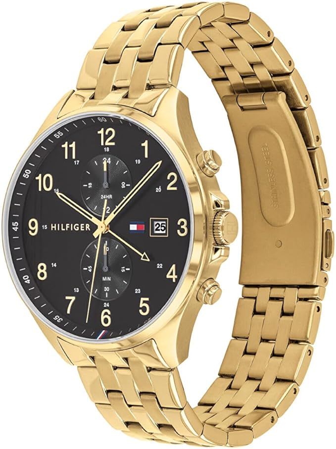 El Reloj Tommy Hilfiger West 1791708 destaca por su esfera negra con elegantes acentos dorados que aportan un aire sofisticado, mientras la pulsera y caja dorada resaltan su impacto visual. Con cronógrafo multifunción (día, fecha, 24 h), es ideal para quienes buscan funcionalidad combinada con estilo contemporáneo. Una caja de 44 mm de gran presencia y acabado refinado para un look moderno con carácter. Incluye 2 años de garantía oficial.
