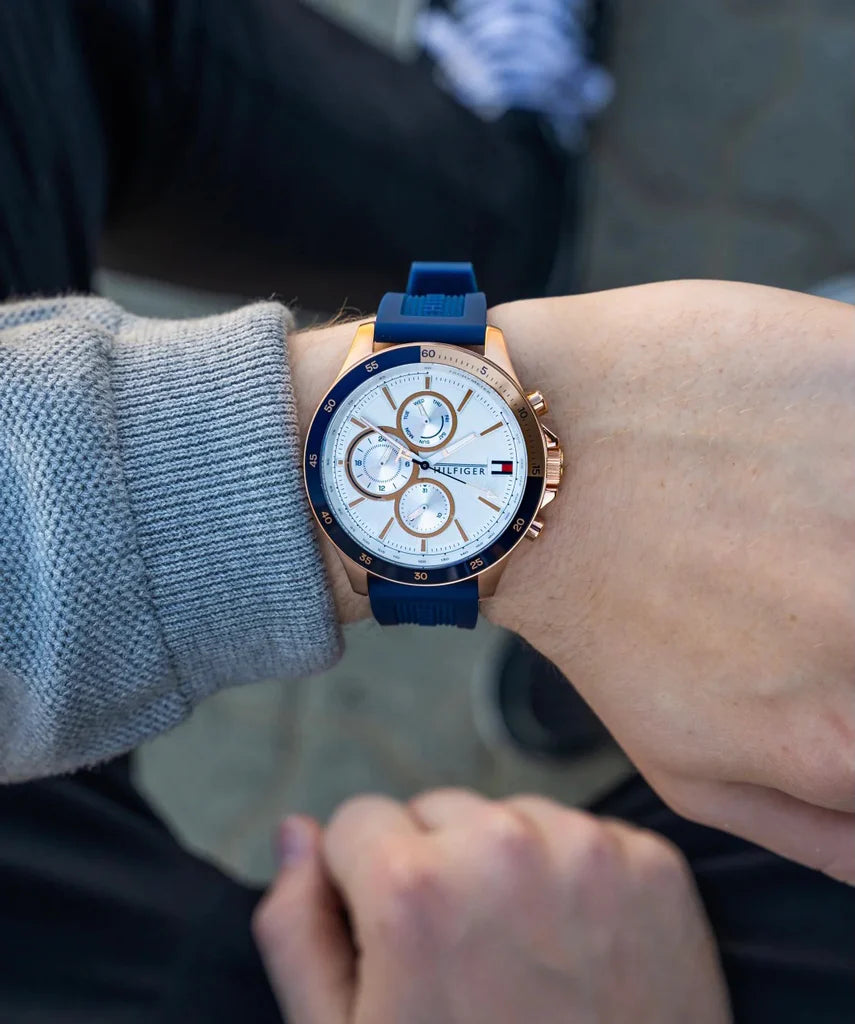 El Tommy Hilfiger Bank 1791778 deslumbra con su esfera blanca sunray enmarcada por caja de acero inoxidable chapado en oro rosa y un bisel negro deportivo. Monta un movimiento de cuarzo multifunción con indicación de día, fecha y subesfera de 24 h, combinado con una cómoda correa de silicona azul de 21 mm que realza su estilo urbano y versátil. Caja de 46 mm de diámetro y grosor de ~11 mm pensada para presencia sin exceso. Perfecto para el hombre activo que busca diseño y practicidad. Incluye 2 años de garantía oficial.