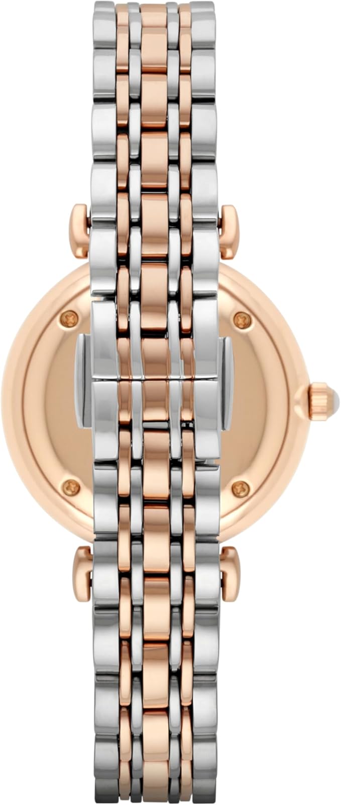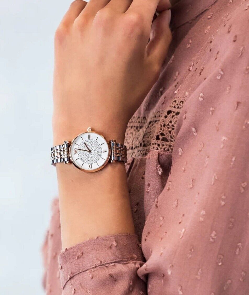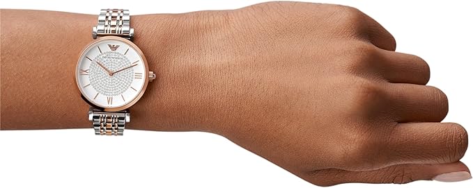 Estilo refinado con delicadeza femenina: el Gianni T‑Bar AR1926 luce una caja de acero inoxidable en dos tonos (plateado y oro rosado) de 32 mm de diámetro y apenas 8 mm de grosor, ideal para la muñeca femenina. Su esfera blanca realza un pavé de cristales en el centro, con índices tipo romano y manecillas doradas que refuerzan su elegancia clásica. Su brazalete bicolor de 14 mm con cierre desplegable aporta comodidad sin perder sofisticación. Con movimiento de cuarzo preciso y resistencia al agua de hasta 30 m, es una pieza elegante y funcional para el uso diario. Incluye 2 años de garantía oficial.