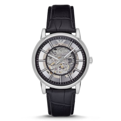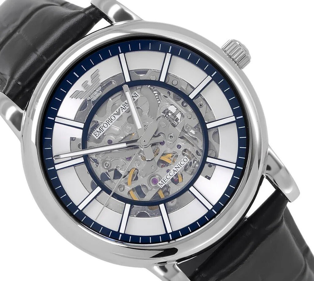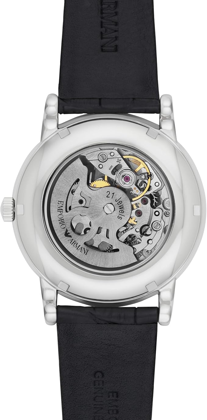 Elegancia mecánica con un diseño contemporáneo: el AR1981 presenta una caja de acero inoxidable de 43 mm con acabado pulido, ofreciendo una presencia robusta y moderna. Su esfera plateada tipo esqueleto revela el movimiento automático, mientras que las manecillas de tono plateado y los índices aplicados aportan un toque de sofisticación. Equipado con cristal mineral resistente a arañazos y resistencia al agua de hasta 30 m, es una pieza que combina estilo y funcionalidad. Incluye 1 año de garantía oficial.